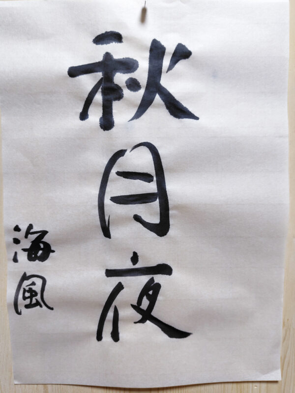 ほんの少しの丸みを帯びて、「秋」「月」「夜」とそれぞれ少しゆるい。墨も少し薄い。そんなことがあいまって、個々の感情に淡く入り込んでくるような作品。