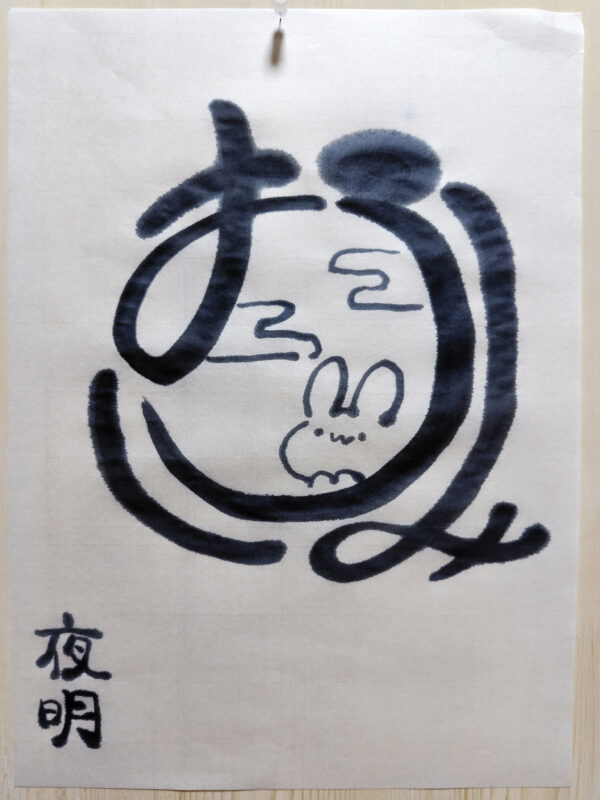 今回のテーマ「中秋の名月」は、“おつきみ”と書いたと本人コメントがありましたが、選者は“おたのしみ”と読んでいましたが、円形に文字絵的に書いて、なかに兎など描いて、昔、丸い月を見上げながら、その月の模様に兎をみていたことを思いださせてくれました。右上の墨のにじみがおぼろ感をだしているようにも思えます。“おぼろ月”とは主に春で春の季語ともなりますが、お月見という人間の感性っていいな、とこの作からも伝わってきますね。