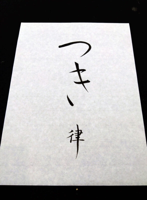 平がなというのは、曲線美で、漢字の直線美と比較できますが、平がなと合わせようとすると、漢字が曲線化して行書や草書となったりする。この平がなの「つき」は、平がなの曲線で成り立っていつつも、凛とした線条で、澄み切った世界を表してくれました。